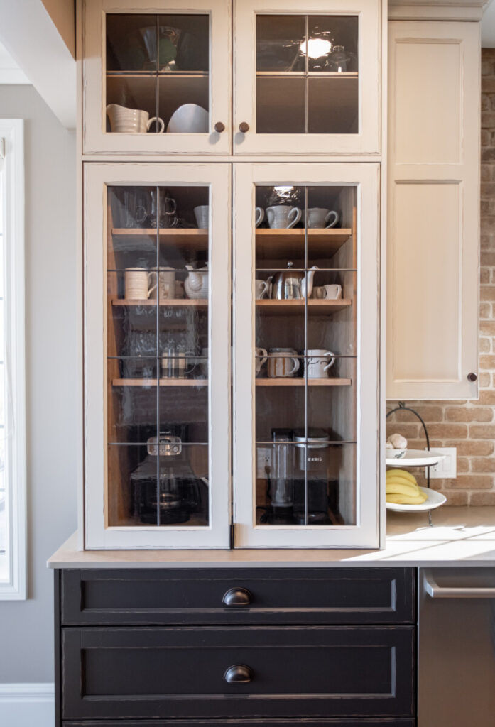 Glass cabinetry is one of the best ways to add your personality to a kitchen. First, by selecting the type of glass – i.e. clear, antique, reeded, mirrored, and more – and second, by choosing what you display inside.