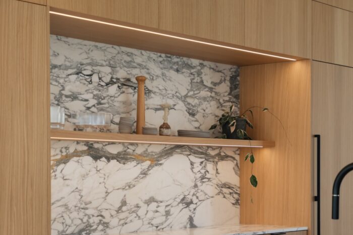 The best cabinetry lighting is designed in from the start and installed as part of the manufacturing process – not added on site later by a third party. Look for custom cabinetmakers who can conceal wiring, rout LED channels, and coordinate installation for a seamless finish.
