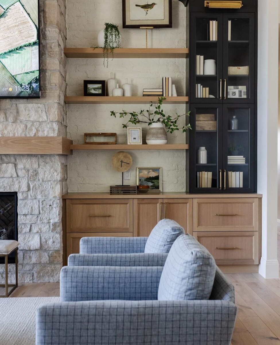 This is the perfect season to think about how your fireplace wall can do more – not just visually, but functionally. Closed cabinetry below helps tuck away the everyday clutter, while open shelving above gives you space to show off books, ceramics, or even a few seasonal touches like fall foliage and candles. The right balance of open and closed storage keeps things polished but approachable.