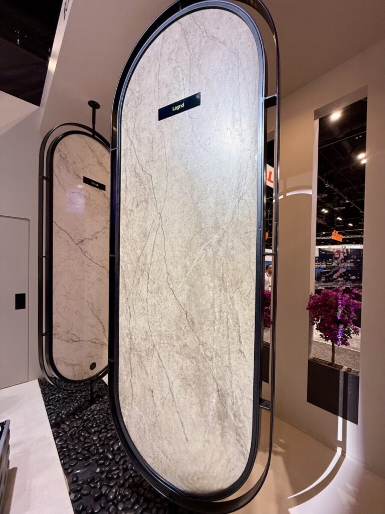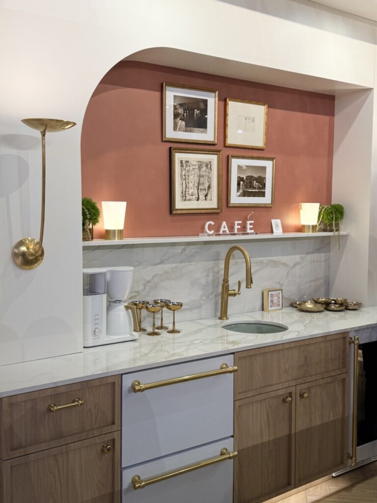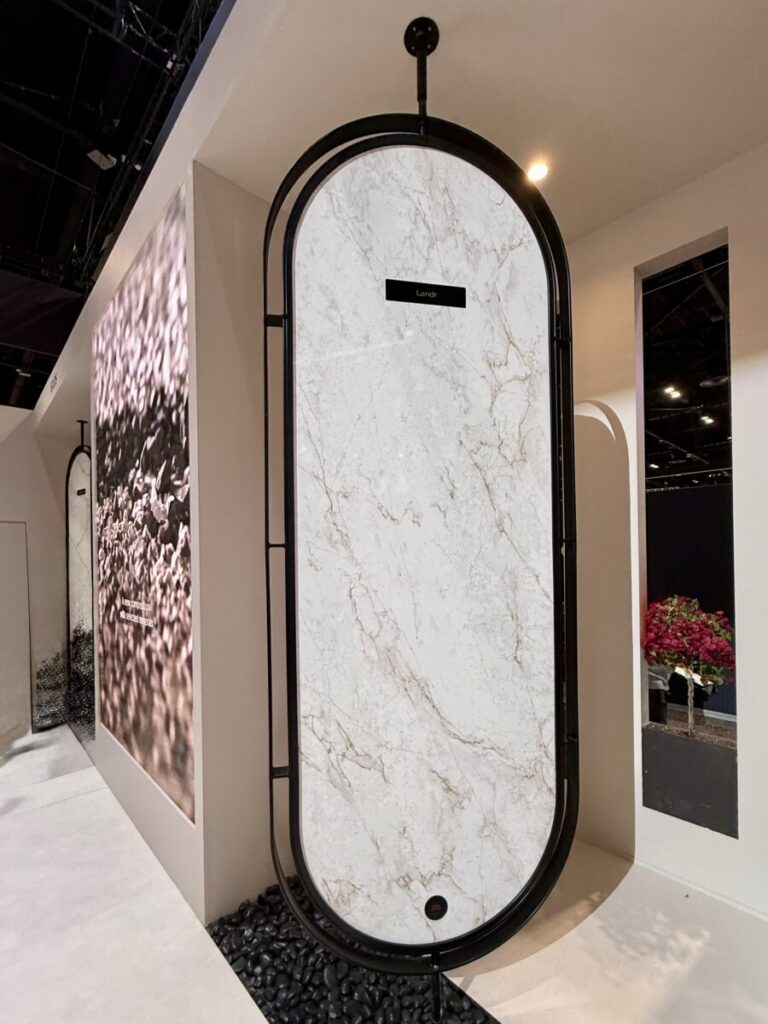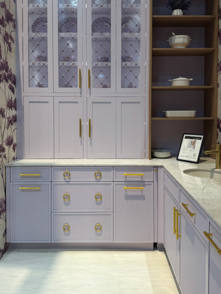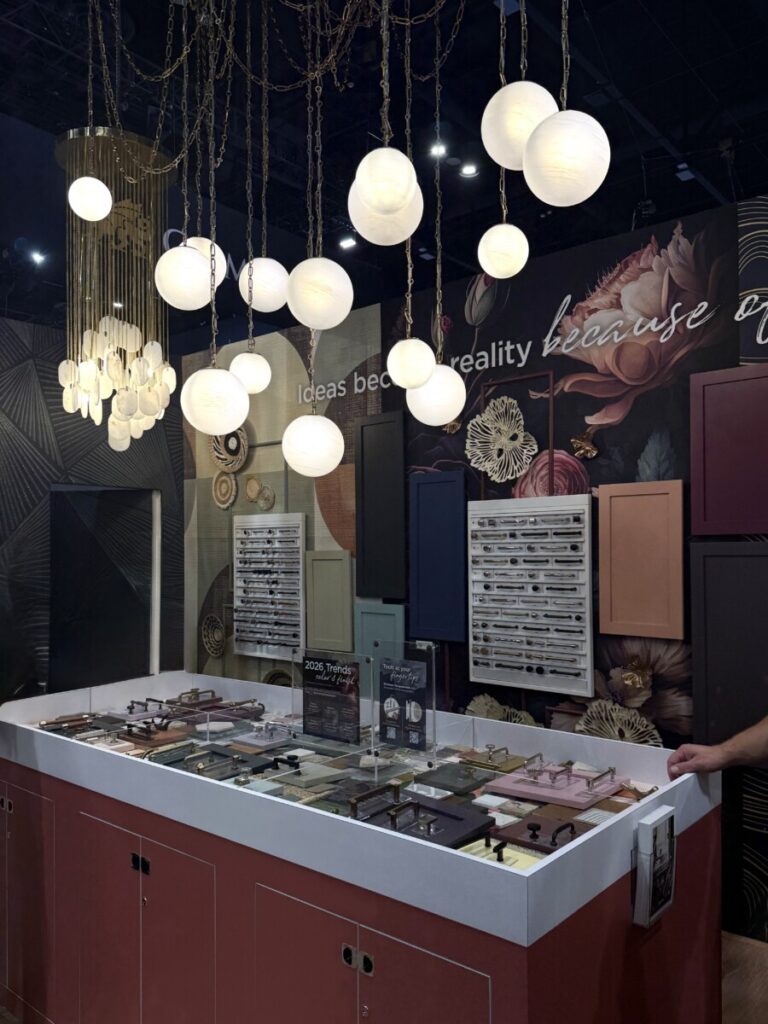 Across the photos we captured at KBIS 2026, one message comes through clearly: 2026 is about tactility, warmth, and artistry. Cabinet doors gain architectural texture, countertops soften into organic veining and rounded forms, and finishes skew warm and expressive – from brushed brass to saturated paint colors and boutique‑style lighting.
