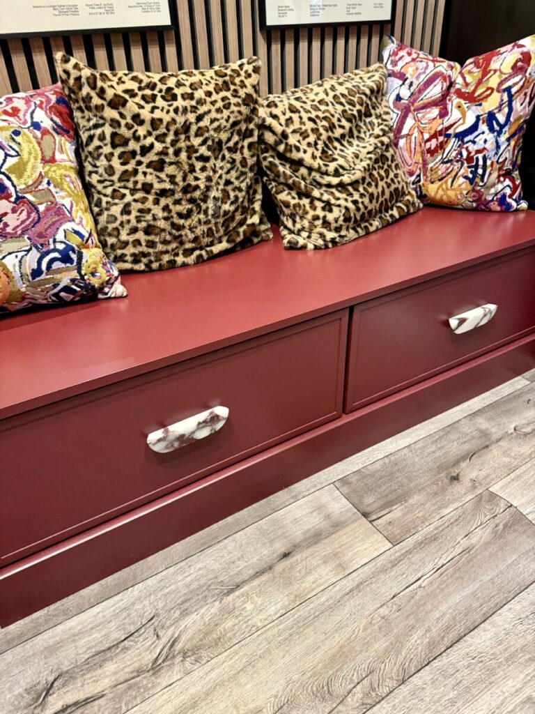 Deep red bench with patterned pillows and stone‑look pulls: utility with personality.
