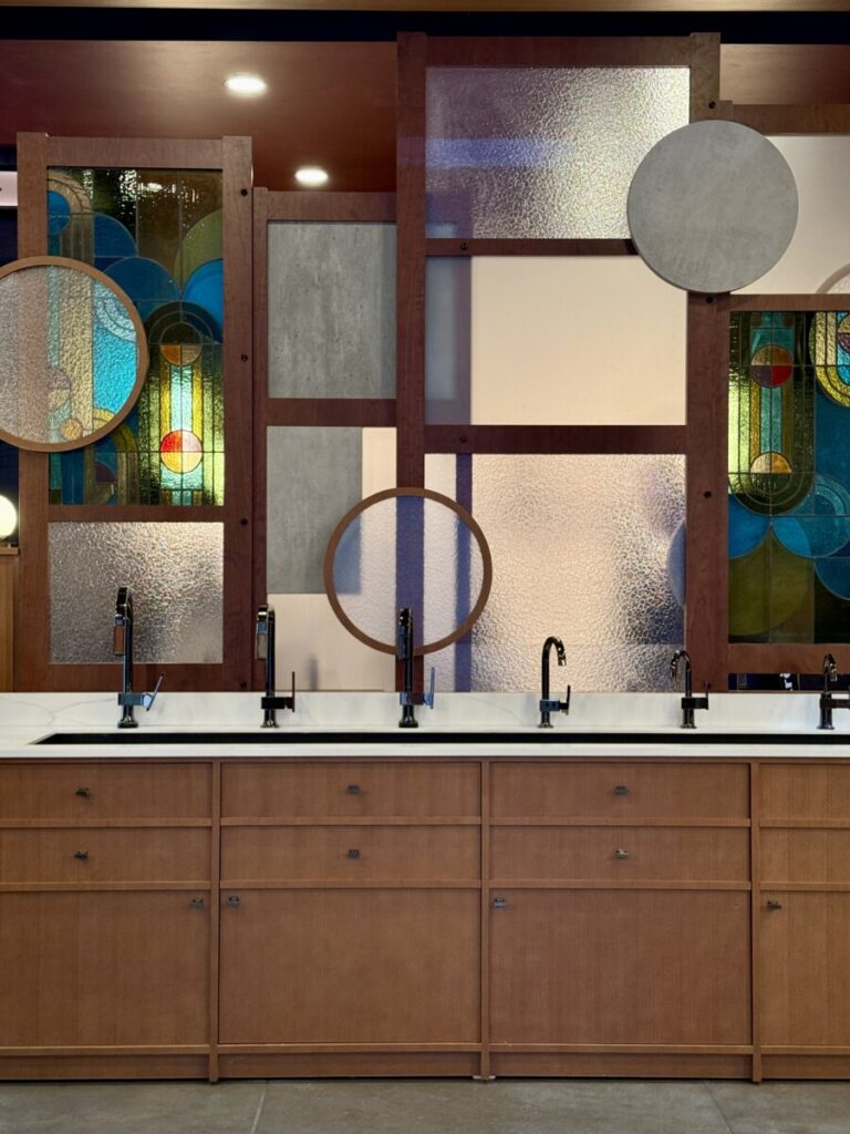 Decorative glass partition behind a faucet run: artful screening for kitchens and bars