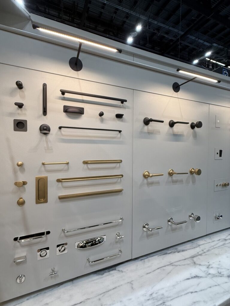 • Hardware becomes a gallery. Larger scales, elongated pulls, and curated finish families are showcased like fashion accessories.