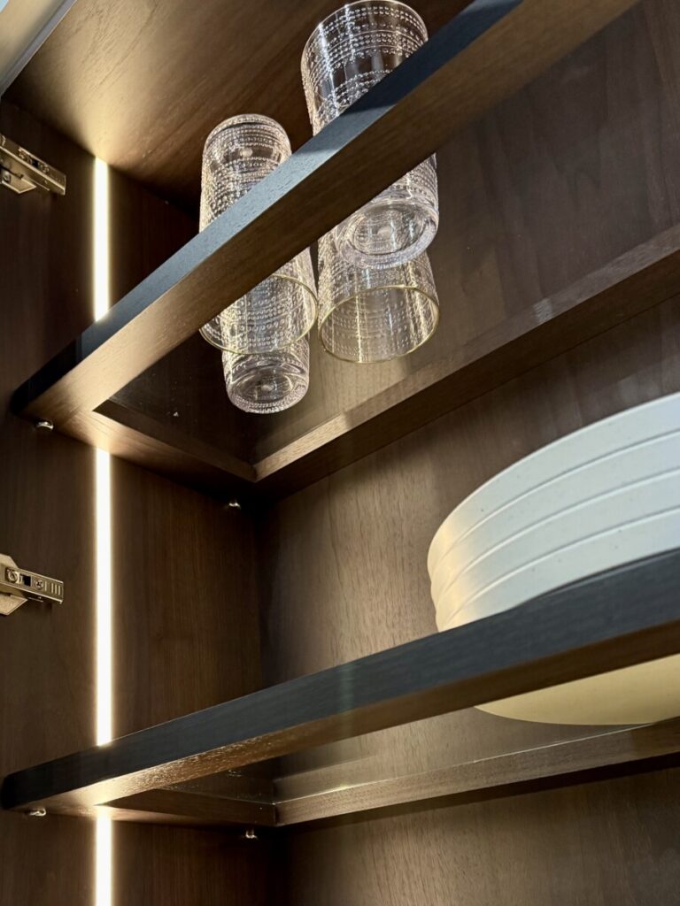 Interior‑lit cabinet with glass shelves: “museum lighting” that elevates everyday storage.