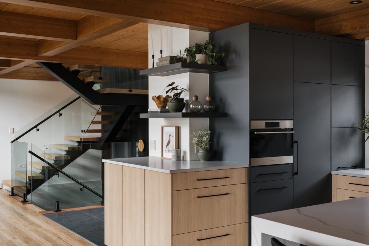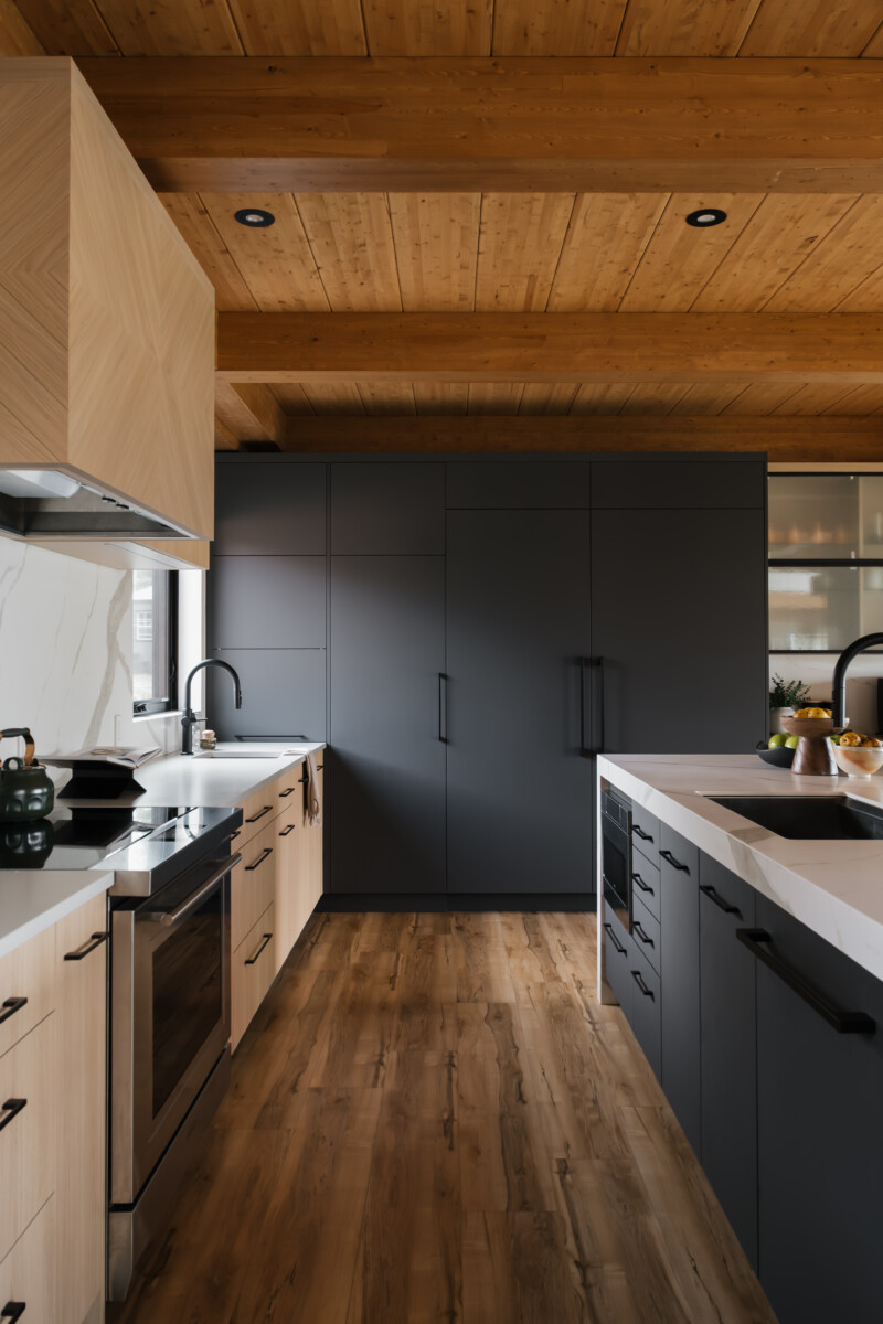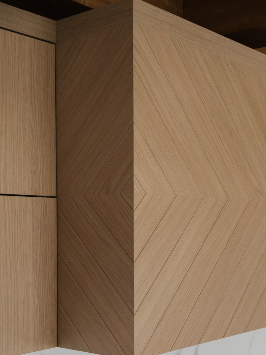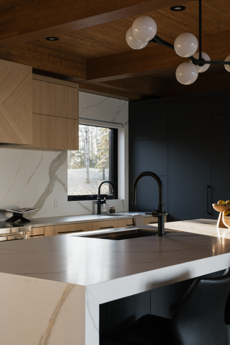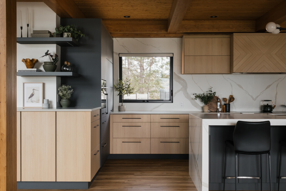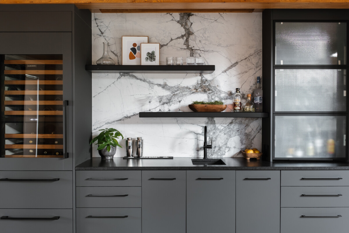 Finishes: Graphite Grey UV Lacquer, Vicenza Oak TFL | Countertop: Laminam Calacatta Michelangelo, Caesarstone Stoneburst